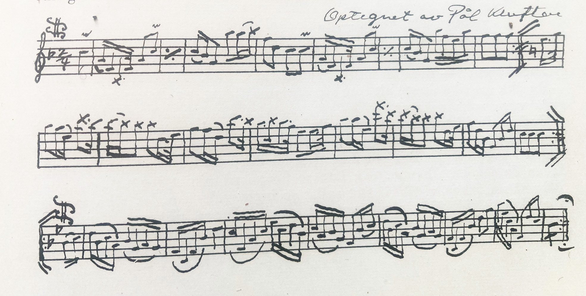 Og denne reinlender er god. Ja, og så hører den Rondane til. Den har vært bruk på setrene i Rondane helt siden mesterspelmannen i Sel, Hans Vineshaugens dager. Denne varianten har jeg tegnet op efter Anton Berge på Vinstra, så den er velkjent i Fronsfjellet også. Det er ikke bare fjellgubbene ved Atnasjøen som har svinget sig efter den! Den har noe av fjellets makt og viddens vemod over sig, så det var naturlig å kalle den Rondane-reinlenderen.