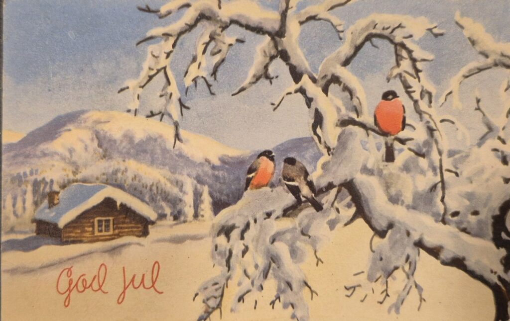 Med dette julekortet frå 1957, adressert til Karen (f. Øium) og Jakob Hansen på Nyseth i Kvam, ønskjer vi våre følgjarar ei riktig God Jul! Julekortet er lånt frå Gro Anita Hansen Resset. Utgivar: Mittet.