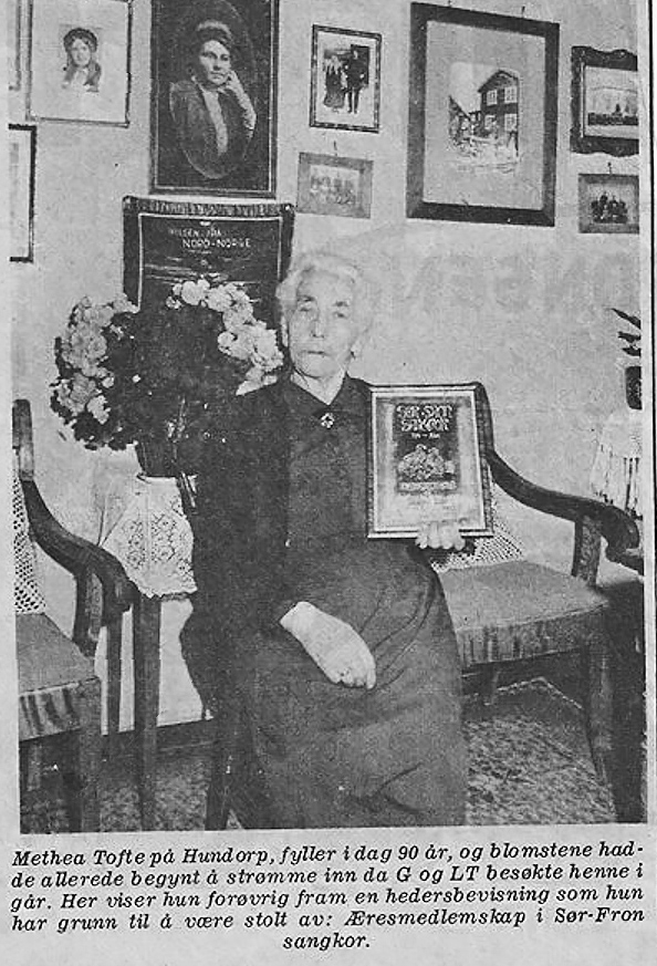 GogLT 27.9. 1978: – Folk hadde mer omgang med hverandre før i tiden – og de var mer fornøyde. Det var tyle å være ung den gangen. Vi måtte nok slite, men vi syntes vi hadde det bra likevel, sier Mathea Tofte på Hundorp til G og LT og minnes den tiden hun var ung. 90 år fyller hun i dag og har opplevd et langt liv med både lyse og mørkere dager. Hun bodde sammen med syv søsken på en liten husmannsplass på Hundorp: – Vi var fire gutter og fire jenter. Det var ikke snakk om en seng på hver da. Nei, vi måtte nok finne oss i å være både tre og fire unger i samme seng. Vi hadde tre kyr, ei kvige og rundt 15 sauer. Det var ikke noen stor buskap, men vi klarte oss.