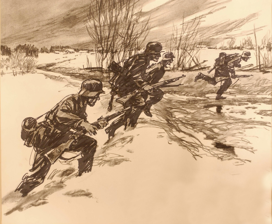 Denne eskadronen var ferdig mobilisert 11. april og ble den 14. sendt til området ved Tangen stasjon, hvor også tre av regimentets andre eskadroner ble samlet. Litt lengre syd, ved Strandlykkja stasjon, hadde vi en fremskutt vaktstilling, som tyskerne gikk til andrep på fire ganger, hver dag fra den 14. og til og med den 17., før det lyktes for dem ved hjelp av tungt artilleri, som vi ikke hadde noe å sette opp i mot, å kaste nordmennene tilbake til Tangen.