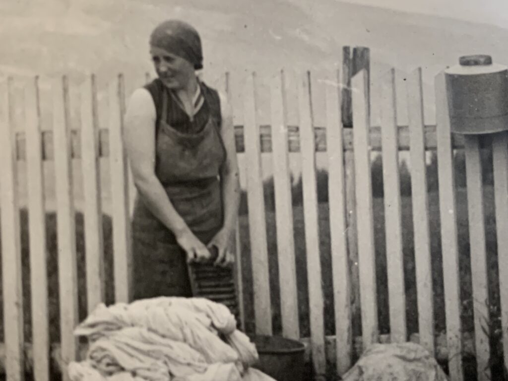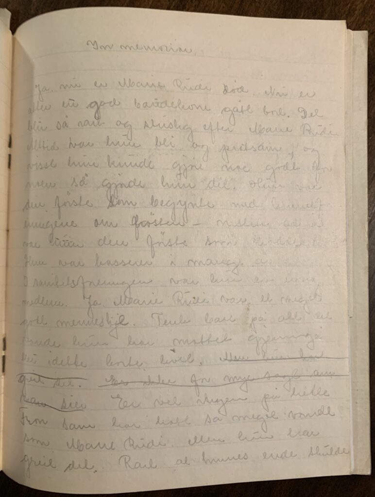 Jeg husker da hun kom til Rusten den xx april 1940. Da kom hun kl. 07 om morgenen sammen med et stort følge og spurte om de skulde få være hos oss, for tyskerne var i anmars. Og hun hadde mel med sig. Jeg husker hun lavet en rett inne på kjøkkenet og jeg en annen rett nedi bryggerhuset. Vi var 24 stykker i xx dager. Marie var alltid blid og tok alt bra. Blir så rart å gå forbi Lidarheim og ikke se Marie gå over gårdsplassen. Ja, hun har spanderet kaffe og kaker på mang en, altid så godt det hun hadde. Ja, nu ved Marie Rudis bortgang, står vi i gjen med et godt, varmt minne som ikke fort blir glemt.