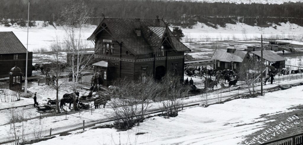 Frå den gongen gjestane kom med tog på påskeferie. Slik var det faktisk til opp mot 1960-70 talet, da mange av hotellgjestane kom med tog til Vinstra, og vart skyssa til fjells med hest, og etter kvart med bil og buss. Utsnitt av fotografi frå samlinga etter Herman Olsen, som viser Vinstra stasjon Påsken 1907. Fotograf: Hans H. Lie.