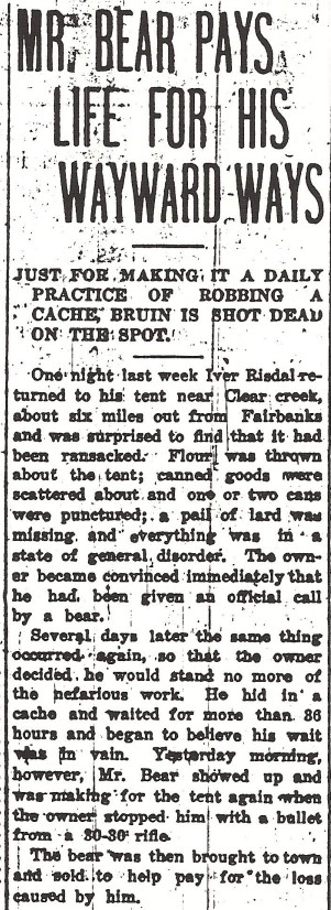 Iver hadde den faste bustaden sin i Fairbanks, men kunne opphalde seg i månadsvis som pelsjeger langt inne i villmarka. Lite grann gull fann han nok, og i eit brev til bestefar min, som var bror hans, skriv han at han har tenkt å sende honom ein liten gullklump, for moro skuld!