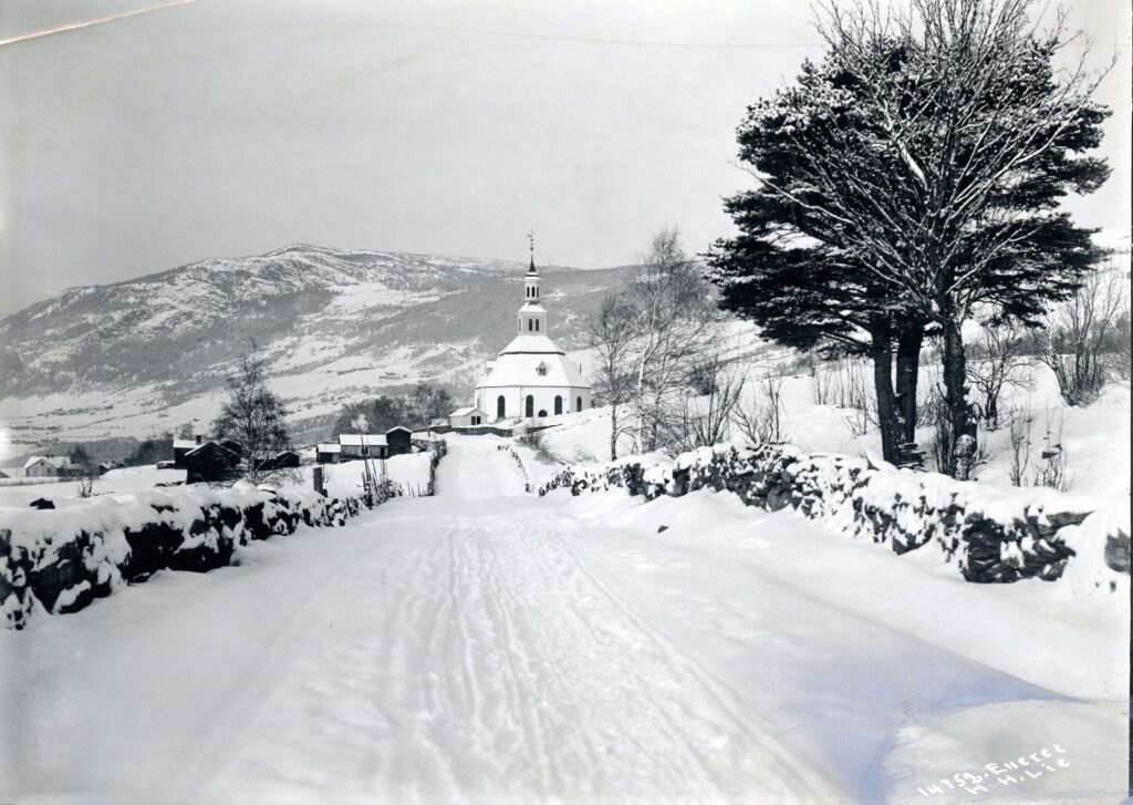 «Vinterbillede fra Søndre Fron» har Herman Olsen kalla dette bildet av Sør-Fron kyrkja, som har vore brukt til å lage postkort for Gudbrandsdal bokhandel. På baksida er det påskrive vinteren 1912/13. Frå fotoarkivet etter Herman Olsen. Fotograf H.H. Lie.